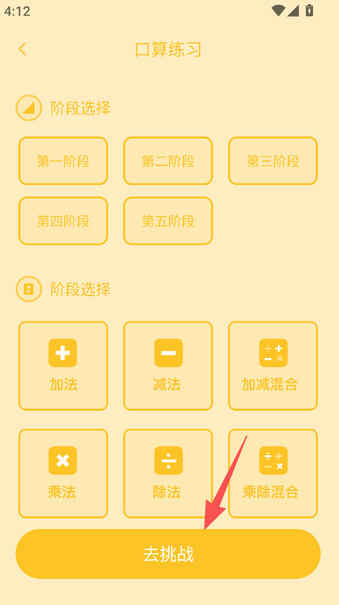 2、选择阶段和运算类型,点击去挑战。