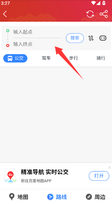 3、在指定的输入框中分别填写行程的起点与终点信息,即可获取公交路线方案。