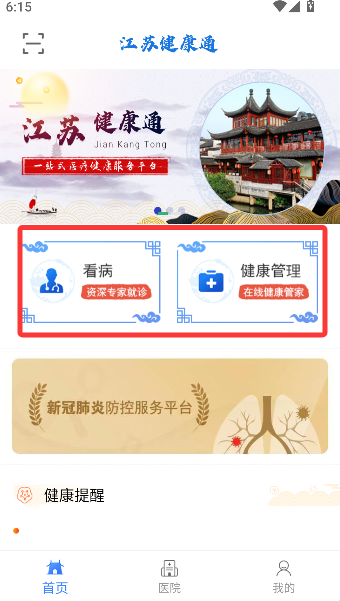 1、打开APP首页就像迎来一位全能健康管家,看病挂号与健康管理服务分列两旁待您点选。