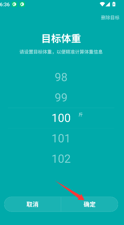 2、通过滑动选择器或输入框设定具体数值作为目标体重,确认无误后点击"确定"按钮完成设置。