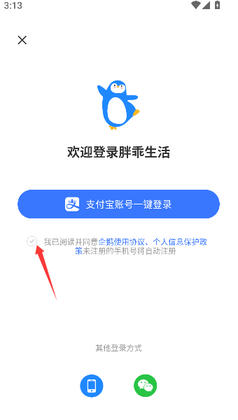 1、当您打开企鹅共享洗衣房软件后,首先需要仔细阅读并勾选同意用户协议和个人信息保护政策,以确保您了解相关条款并保障隐私安全。
