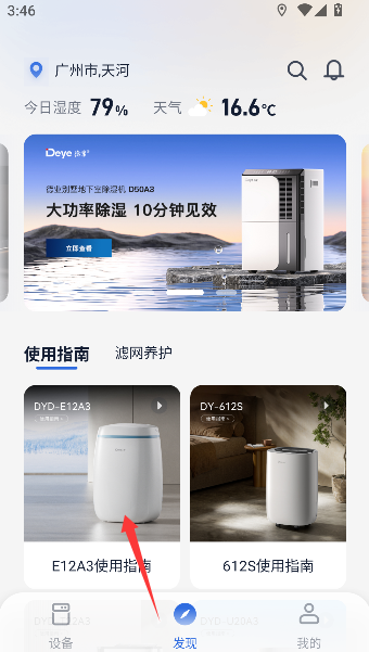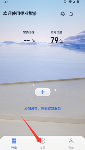 1、打开应用后,在首页底部导航栏找到并点击“发现”栏目,进入后选择设备选项。