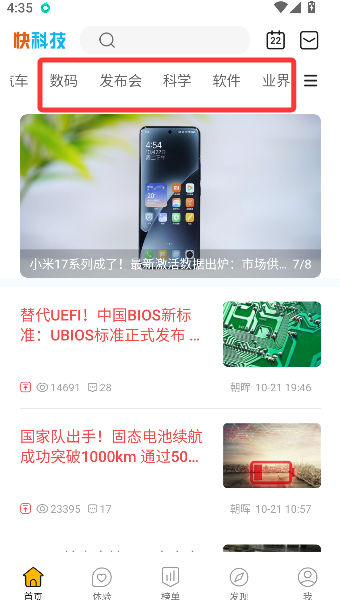 2、通过左右横向滑动顶部导航区,可查看更多分类板块如“数码”、“发布会”、“科学”等,覆盖广泛科技领域话题。