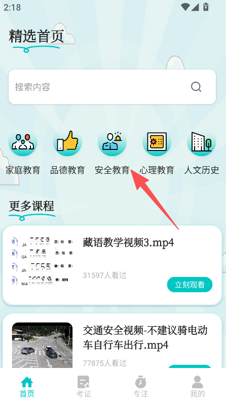 1、打开软件,点击安全教育等课程分类。