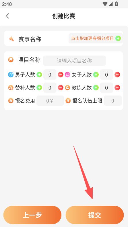 3、提供提交功能,完成信息填写后可提交赛事,实现赛事创建的闭环,助力赛事组织落地。