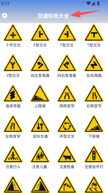 1、进入交通标志大全,查看十字交叉、T 型交叉等各类交通警示标志。