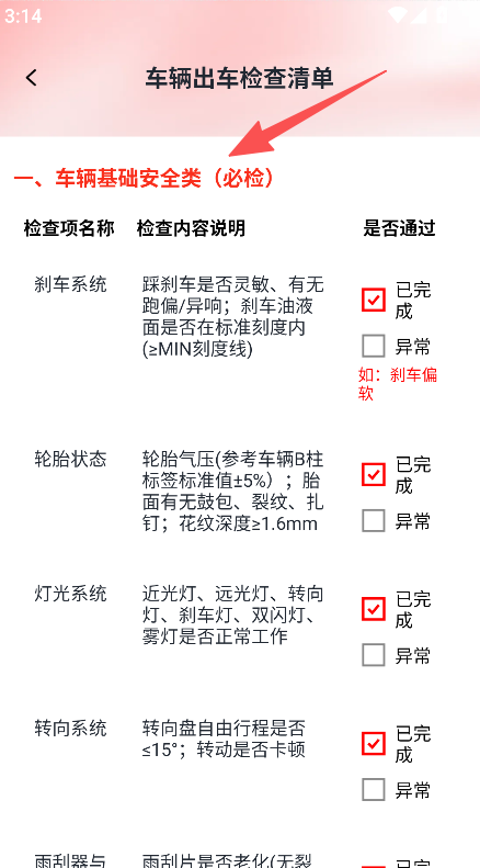 2、填写车辆出车检查清单的基础安全类必检项目,勾选是否通过。