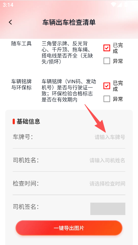 3、输入车牌号、司机姓名等基础信息,点击一键导出图片完成检查记录。