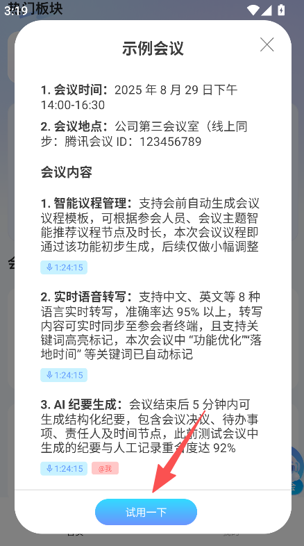 2、点击试用一下,体验智能议程、语音转写、AI纪要生成功能。