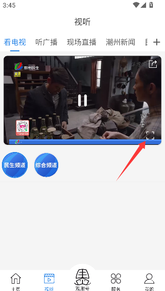 1、直播播放,实时收看潮州综合、公共等频道的电视信号。
