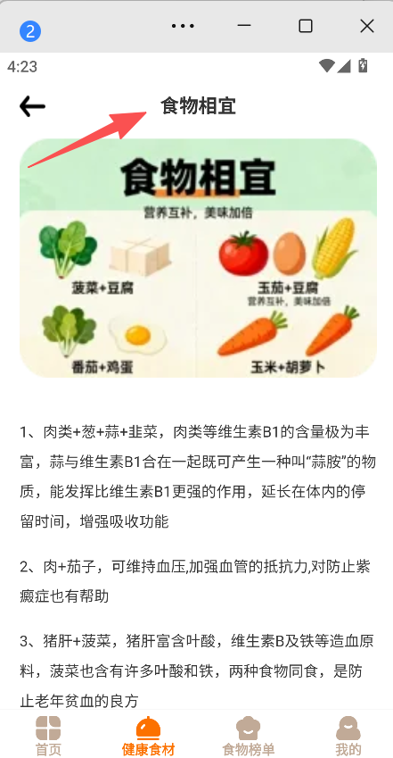2、食物相宜查询功能,展示多种食物营养互补的搭配方式,指导用户科学搭配食材。