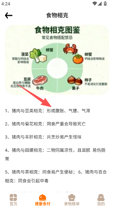 3、食物相克查询功能,列出食物搭配禁忌,避免因食材相克影响健康,保障饮食安全。