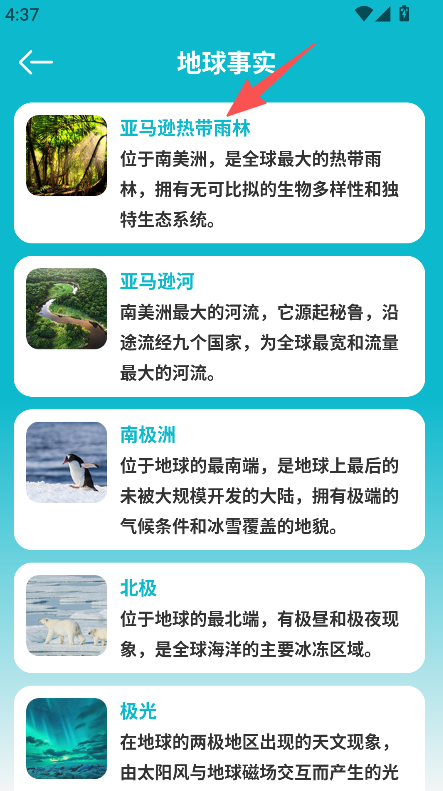 2、详细知识展示功能,对每个科学主题进行多维度讲解,如亚马逊雨林的面积、物种等,助力深入学习。