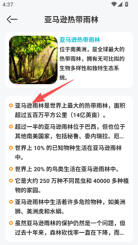3、点击亚马逊热带雨林,查看详细科普内容。