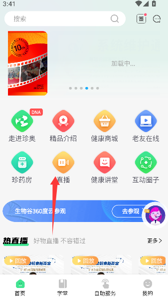 1、打开珍奥保健软件,在主界面找到并点击"直播"入口,像推开一扇通往健康茶话会的大门。