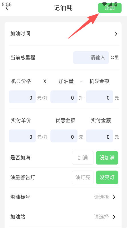 3、填写加油时间、里程、油量等信息,点击添加,完成油耗记录。