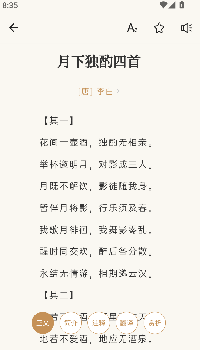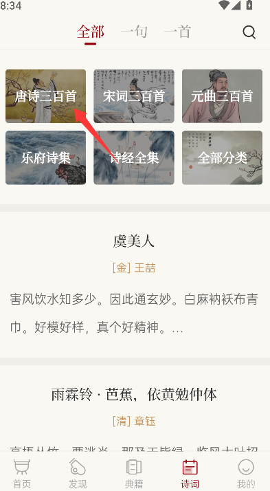 1、在应用主界面的底部导航栏中找到“诗词”分类入口,点击即可进入诗词主题专区。