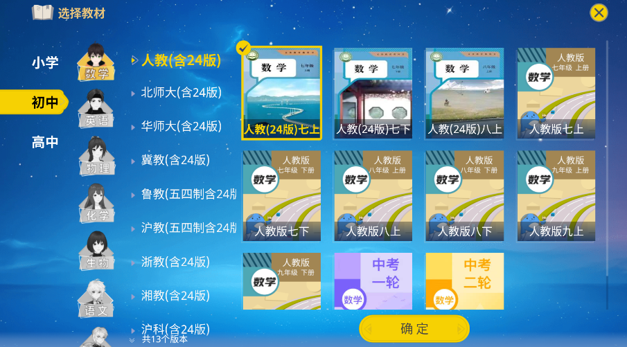 1、打开软件后,先在教材选择界面中选择学习阶段,可在小学、初中、高中等不同版本中自由切换,匹配相应课程内容。