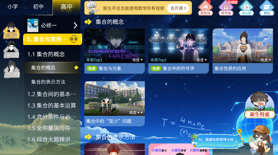 2、选定高中阶段后,进入数学模块中的“集合的概念”学习单元,可查看详细课程讲解与配套练习题目。