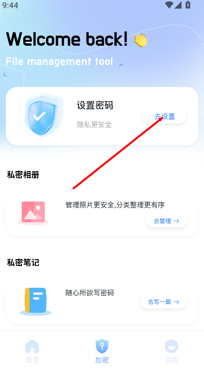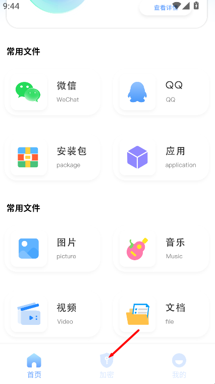1、进入应用后,点击打开加密板块,进入文件加密管理页面。