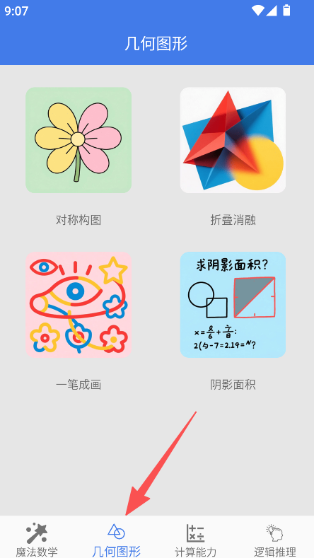 《魔法数学》是一款专注数学学习的软件,涵盖几何图形、计算能力、逻辑推理等板块。几何图形板块有对称构图、折叠消融、一笔成画、阴影面积等玩法,其中对称构图可调整线条大小、对称数量,还能选择颜色创作。软件通过多样互动形式,将数学知识转化为趣味操作,帮助学习者在玩中提升几何认知、计算能力和逻辑思维,是数学学习的实用助手。
