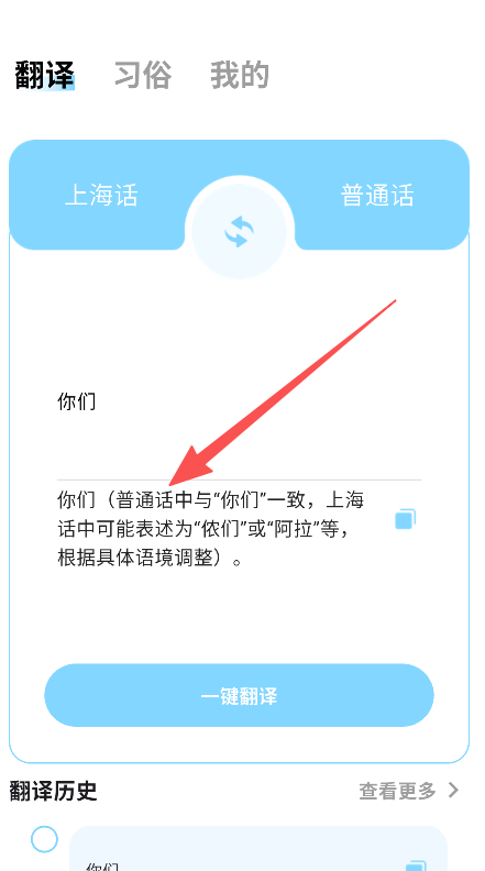 2、点击一键翻译,查看上海话与普通话的翻译结果。