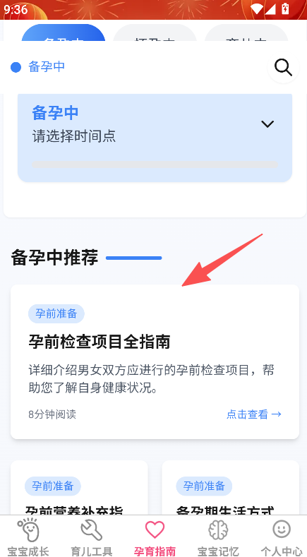 1、具备孕育指南功能,提供备孕阶段的孕前检查、营养补充等专业内容,为用户科学备孕提供知识支持,育儿学习更系统。