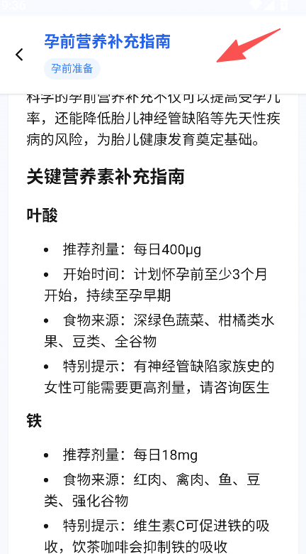 2、支持营养指导功能,详细讲解叶酸、铁等关键营养素的推荐剂量、食物来源,助力孕前营养储备,孕育准备更科学。
