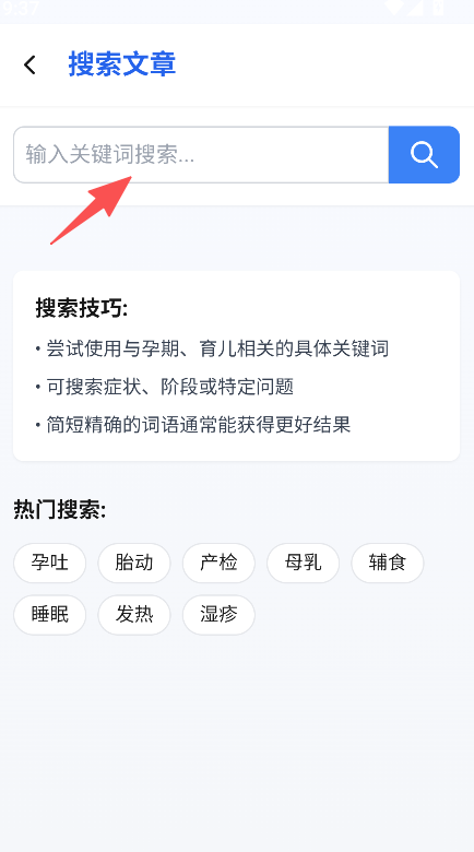 3、搜索功能便捷,支持关键词搜索,搭配搜索技巧提示,可快速找到孕期、育儿相关文章,信息获取更高效。