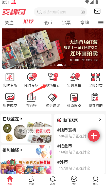 1、首先,在应用主页找到并点击“现场拍卖”按钮,进入正在进行的拍卖活动列表页面。