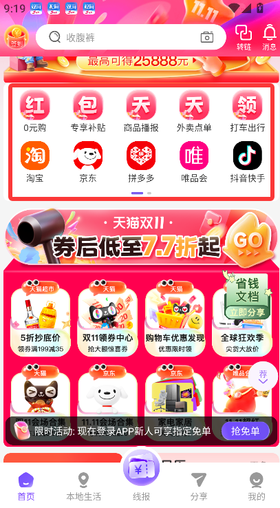 1、启动应用后进入主界面,该界面集中展示了多个合作电商平台的入口与精选商品信息,便于直接浏览与选择。