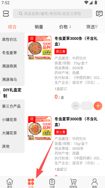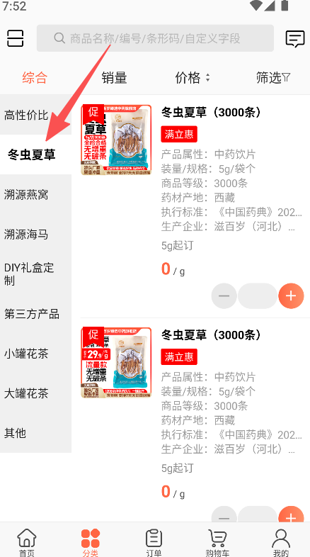 1、点击分类,选择冬虫夏草等滋补品类,浏览商品。