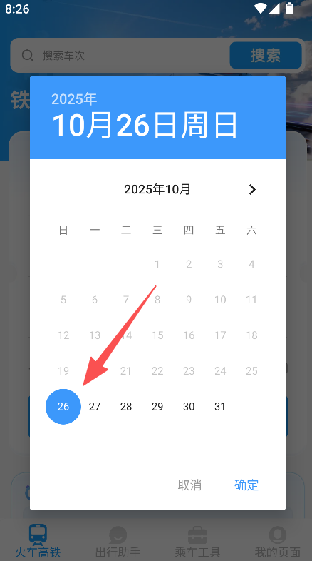 1、打开《铁路火车高铁票务》,选择出发日期,确定出行时间。