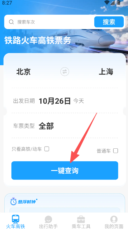 2、选择出发地、目的地,点击一键查询,查看车次信息。