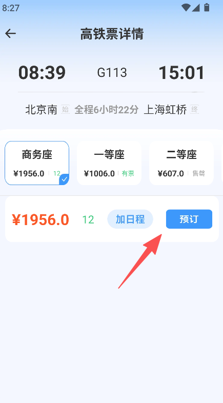3、进入高铁票详情页,选择座位类型,点击预订,完成票务操作。