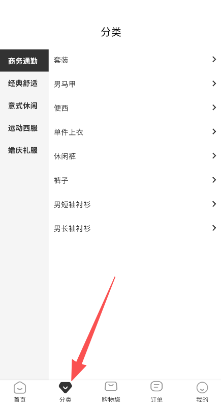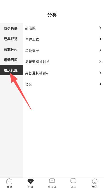 1、点击分类,选择婚庆礼服等男装风格分类。