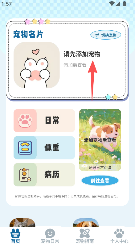 2、添加宠物后,可查看日常、体重、病历模块,记录宠物点滴。
