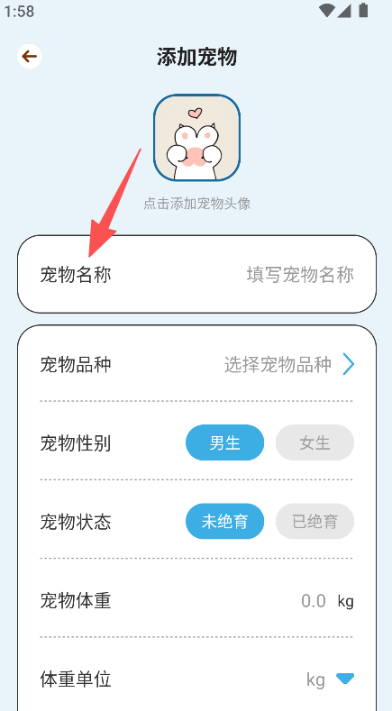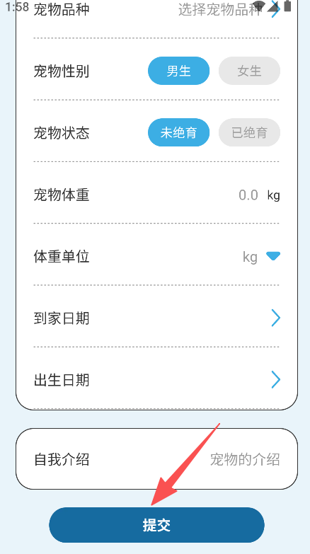 1、点击添加宠物,填写名称、品种等信息,点击提交。