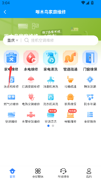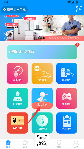 1、在智之屋首页精准点击"上门维修"选项,就像按下召唤家电维修骑士的救星按钮,准备迎接专业救援。
