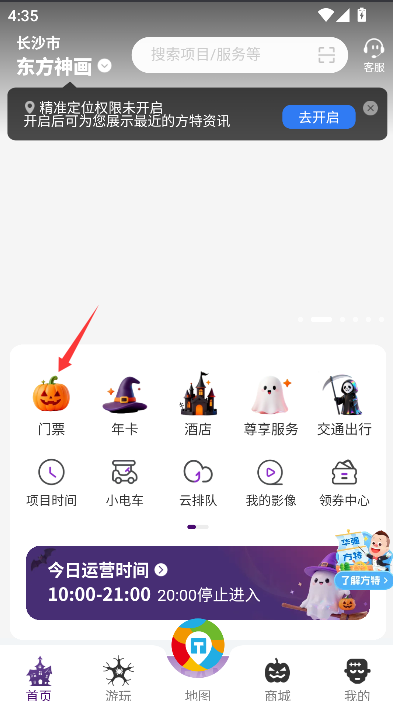 1、在应用首页导航栏中找到并点击“门票”选项,进入门票预订主页面。