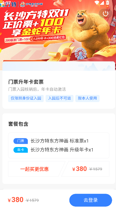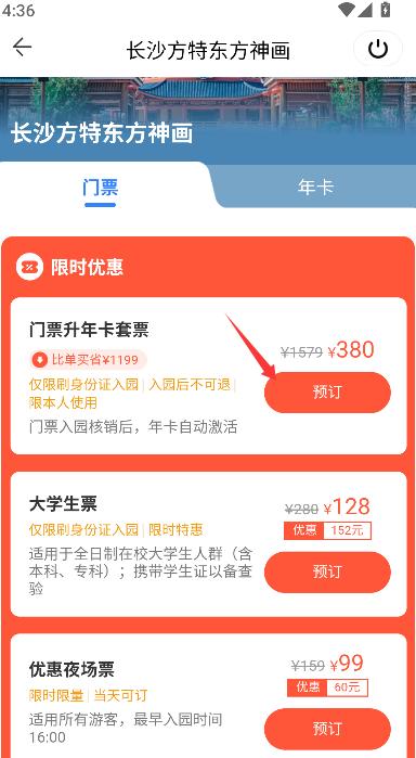 2、浏览展示的各种门票套餐,选择并点击一个心仪的套餐,即可进入该套餐的详细说明与价格页面。
