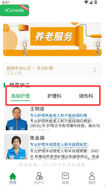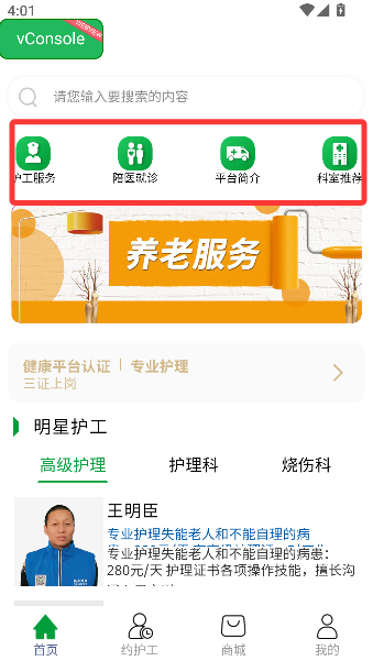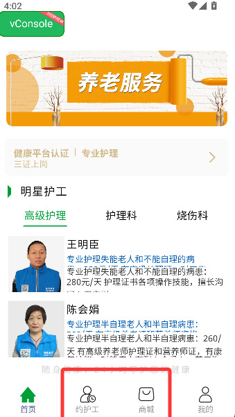 3、页面底部更贴心,约护工像点外卖般轻松,商城购物则默默备齐护理装备,堪称一条龙健康后勤部。