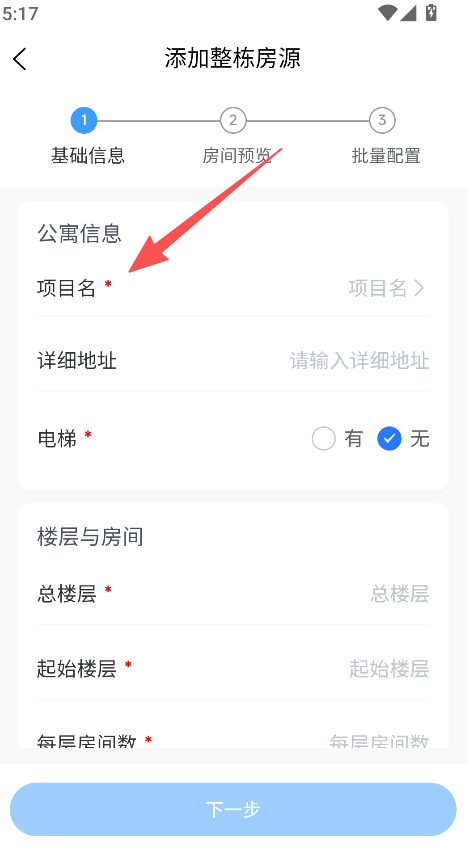 3、填写项目名、详细地址等信息,点击下一步,完成房源添加。