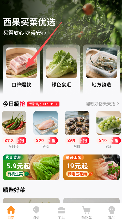 1、点击口碑爆款或品类板块,进入生鲜选购。