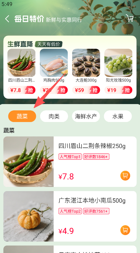 1、具备分类选购功能,可按口碑爆款、蔬菜等分类选品,精准定位目标生鲜。