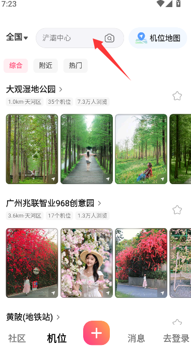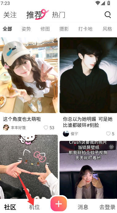 1、在应用首页或导航栏中点击进入"机位"板块,该板块会推荐或编辑精选的拍摄地点与构图参考。