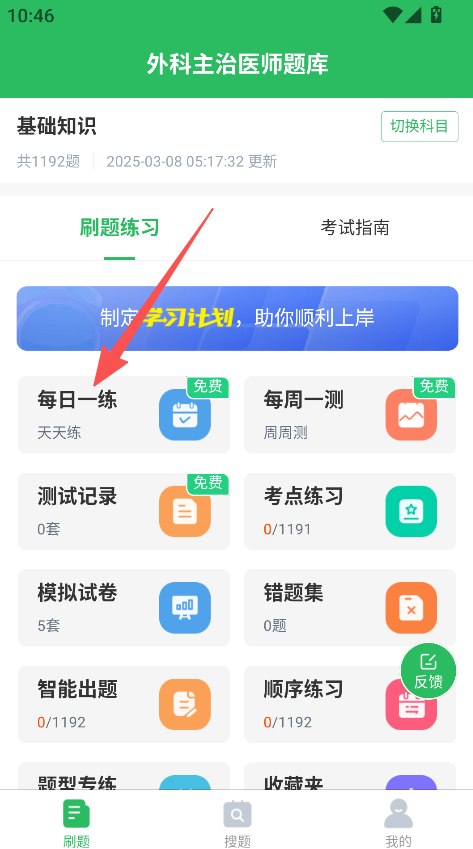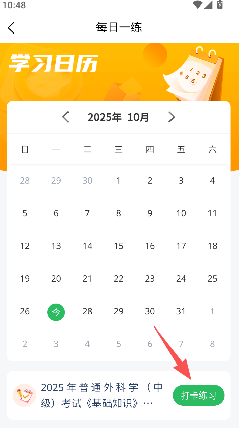 1、具备每日一练功能,可通过学习日历打卡练习,实现外科主治考试题目日常积累,夯实知识基础。