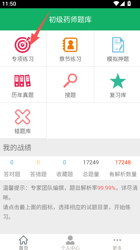 1、聚焦初级药师考试,练习板块涵盖专项、章节、模拟等,备考维度全面,满足考生不同阶段学习需求。