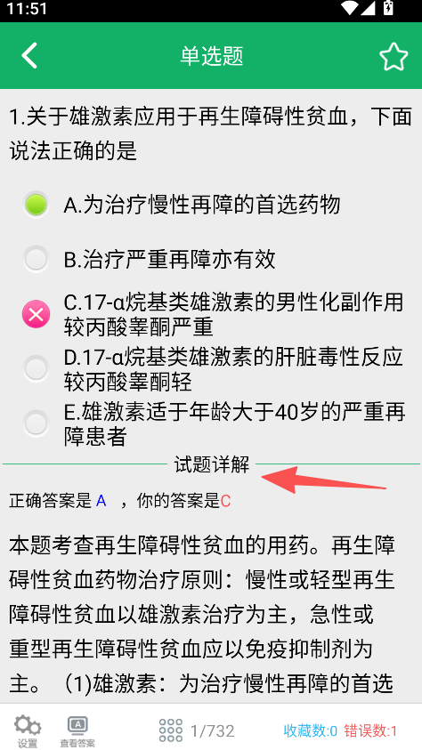 3、解析系统专业,每道题配备详细详解,如雄激素应用题的用药原则说明,考点讲解深入,帮助考生理解。