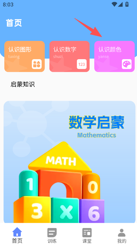 1、打开软件,点击认识颜色,进入颜色认知界面。